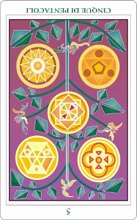 The 5 of Pentacles is an assignment-number card, and is about letting go of your securities. Pentacles element Earth (also) represents material posessions, so this card is about letting go of (some of) your worldly assets.