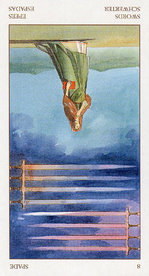 The 8 of Swords is about slowly regaining strength and energy. The 8 is an assignment number, and in the element of Swords it's a bit harder than usual.