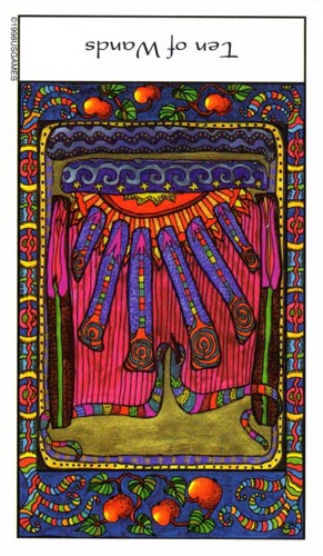 The 10 of Wands is therefore the transition from the element Fire (associated with Wands) to the element Water, associated with Cups. As you might imagine, this not the easiest of transitions.