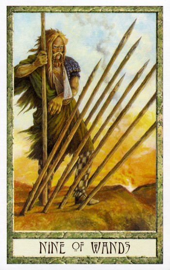 The 9 represents rest after work, which is another thing (like 8) that the element Fire associated with Wands is not very comfortable with. Fire likes to keep going. This rest will probably be spent thinking about what to do next along the course to completion.