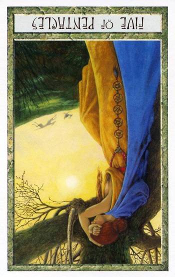 The 5 of Pentacles is an assignment-number card, and is about letting go of your securities. Pentacles element Earth (also) represents material posessions, so this card is about letting go of (some of) your worldly assets.