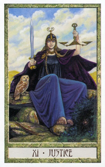 This card carries the number 11. In the Rider-Waite deck, Strength and Justice have swapped places because Waite saw links with the astrological signs Leo and Libra.