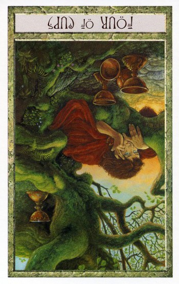 With the 4, the second cycle of this suit is commenced, where a choice between structure and feeling has to be made, where old securities have to be let go of to work towards a new future. But like Wands, Cups don't like structure much, they prefer to be free and dream rather than to make commitments and go for something.