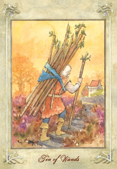The 10 of Wands is therefore the transition from the element Fire (associated with Wands) to the element Water, associated with Cups. As you might imagine, this not the easiest of transitions.