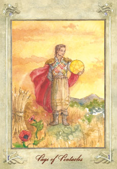 Pages explore and gather information about the road ahead, with an almost naive attitude. The Page of Pentacles is sometimes described as a bridge builder; Pentacles is the suit where the actual work is done, and the Page here enables those that follow to quickly cross difficult terrain.