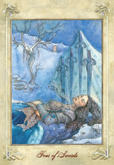 4 is the first number in the cycle of giving things shape. It's about making things real. The element of Swords also relates to making things real, so this enhances the effect so much that arrogance can cause you to exhaust yourself.