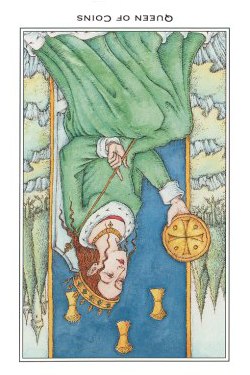 The Queen in the suit of Pentacles becomes aware of her Earthly attributes; she's reliable and sober, able to give good advice.