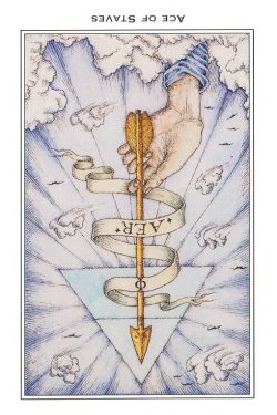 The ace of wands represents the beginning of an idea. The element fire and the number 1 give a powerful combination: enterprise and new beginnings apply to both. This is an energetic combination, which is why the card is generally considered a positive one. Spring is the season associated with this card.