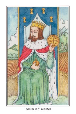 The King of Pentacles uses his Earthly attributes to rule. He goes about his work like an old style business man; he avoids unnecessary risks, aims for real results, and acts from confidence.