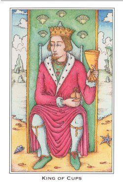 The King of Cups uses his intuition to achieve his ideals. Since Cups are turned inward, and Kings turned to the outside world, this card might be a difficult one, or it could be a powerful one.