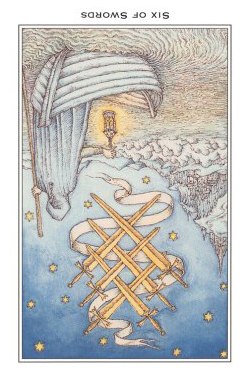 The 6 of Swords is a reward number after the hard assignment in 5 of Swords, it brings you to a safe place to rest a bit.