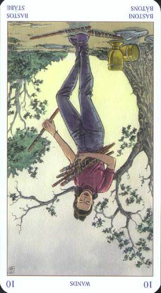 The 10 of Wands is therefore the transition from the element Fire (associated with Wands) to the element Water, associated with Cups. As you might imagine, this not the easiest of transitions.