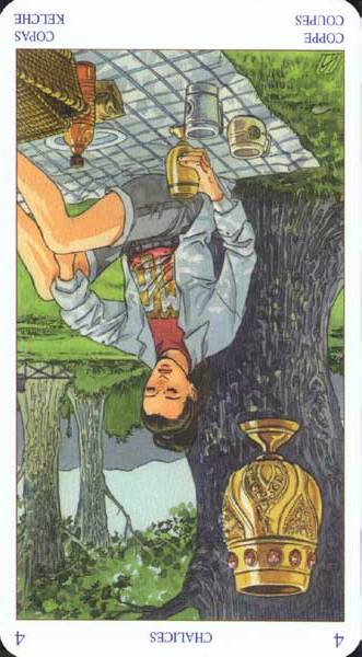With the 4, the second cycle of this suit is commenced, where a choice between structure and feeling has to be made, where old securities have to be let go of to work towards a new future. But like Wands, Cups don't like structure much, they prefer to be free and dream rather than to make commitments and go for something.