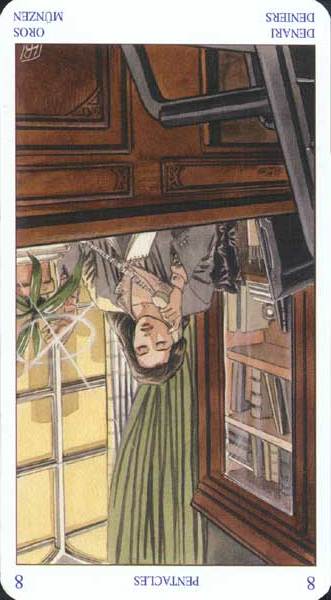 The 8 of Pentacles is about keeping up the hard work you're doing, and trying to be happy about doing that work at the same time. While the 3 of Pentacles is about completing a masterpiece, the 8 of Pentacles is about doing the apprentice work that makes you a master of your trade.