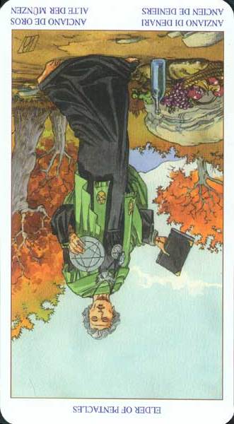 The King of Pentacles uses his Earthly attributes to rule. He goes about his work like an old style business man; he avoids unnecessary risks, aims for real results, and acts from confidence.