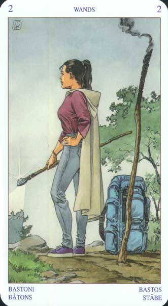 The 2 of Wands represents the research and digestion of a new idea. The number of this card and it's element are somewhat in conflict; while the 2 is focussed inwards, the Wand's element fire is outgoing. Fire wants to steam ahead while the blackbox 2 asks for patience.