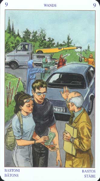 The 9 represents rest after work, which is another thing (like 8) that the element Fire associated with Wands is not very comfortable with. Fire likes to keep going. This rest will probably be spent thinking about what to do next along the course to completion.
