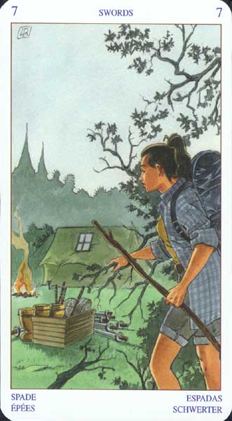 The 7 of Swords is about making slow progress because you can't trust the situation and/or people around you.