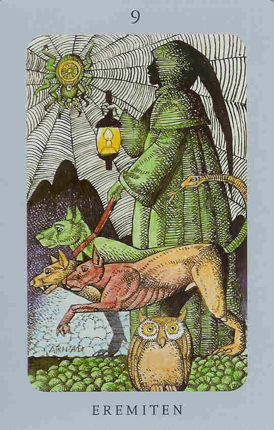 The Hermit carries the number 9. This is the highest base number. After 9 the composed numbers emerge. Therefore the number 9 is the gateway to a higher order. It is also a place to rest before embarking on the next leg of the journey.