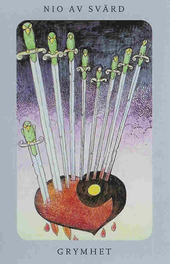The 9 of Swords represents relief from cropped-up grief. The number 9 is a number of reward and rest and accomplishment. In the element of Swords there is not a lot of time for rest, but without any rest you'd just burn yourself out.