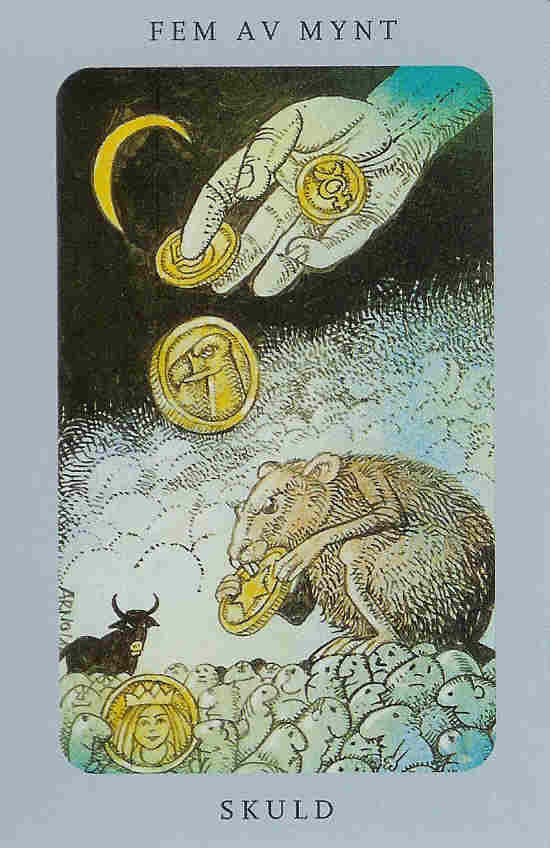 The 5 of Pentacles is an assignment-number card, and is about letting go of your securities. Pentacles element Earth (also) represents material posessions, so this card is about letting go of (some of) your worldly assets.
