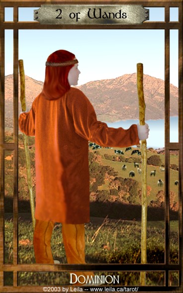 The 2 of Wands represents the research and digestion of a new idea. The number of this card and it's element are somewhat in conflict; while the 2 is focussed inwards, the Wand's element fire is outgoing. Fire wants to steam ahead while the blackbox 2 asks for patience.