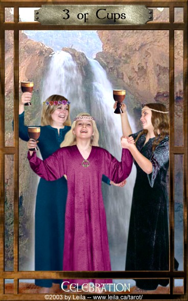 The 3 of Cups represents hope, faith and love. The 3 is a reward number and in this suit of Cups your feelings during that number will be that of joy and self-contentment.