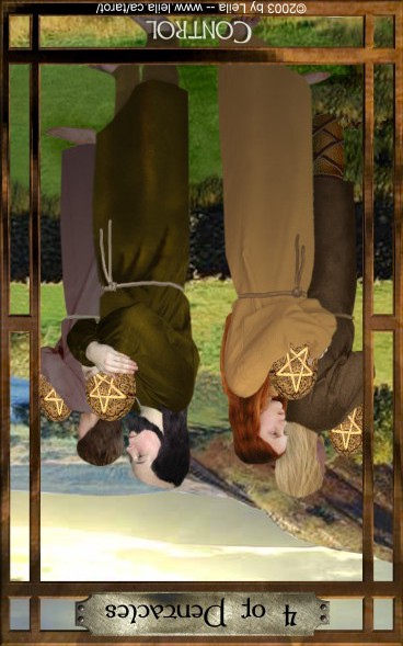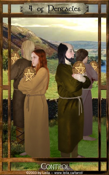 The 4 of Pentacles is about holding on to what you got. The number 4 represents structure and order, and fits well with the suit's element, Earth.