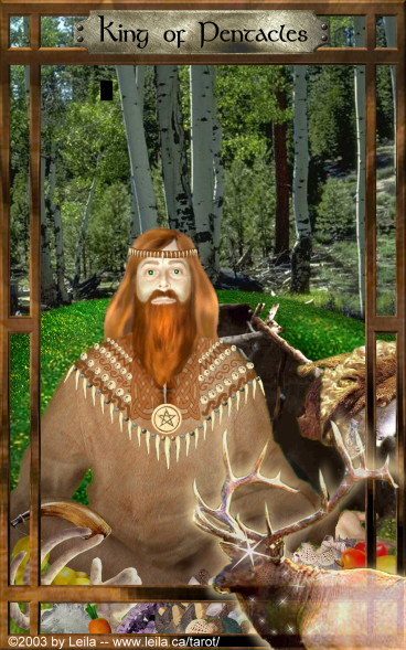 The King of Pentacles uses his Earthly attributes to rule. He goes about his work like an old style business man; he avoids unnecessary risks, aims for real results, and acts from confidence.