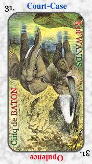 The 9 represents rest after work, which is another thing (like 8) that the element Fire associated with Wands is not very comfortable with. Fire likes to keep going. This rest will probably be spent thinking about what to do next along the course to completion.