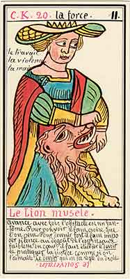 This card carries the number 11. In the Rider-Waite deck, Strength and Justice have swapped places because Waite saw links with the astrological signs Leo and Libra.
