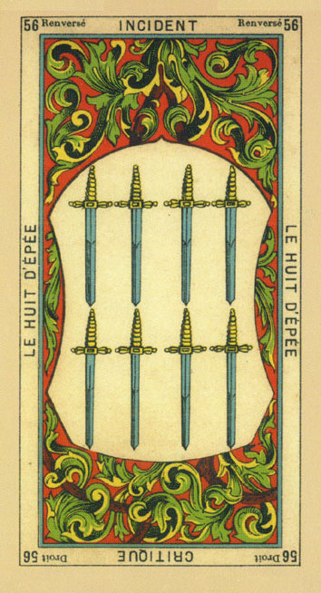 The 8 of Swords is about slowly regaining strength and energy. The 8 is an assignment number, and in the element of Swords it's a bit harder than usual.