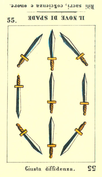 The 9 of Swords represents relief from cropped-up grief. The number 9 is a number of reward and rest and accomplishment. In the element of Swords there is not a lot of time for rest, but without any rest you'd just burn yourself out.