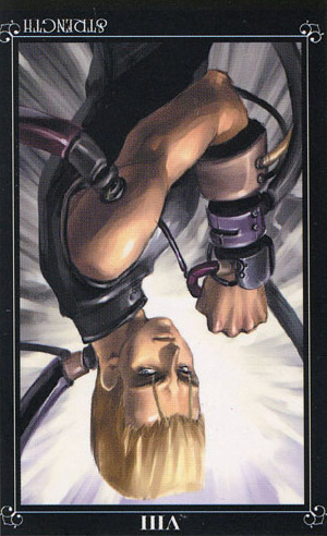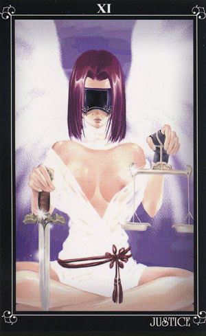 This card carries the number 11. In the Rider-Waite deck, Strength and Justice have swapped places because Waite saw links with the astrological signs Leo and Libra.