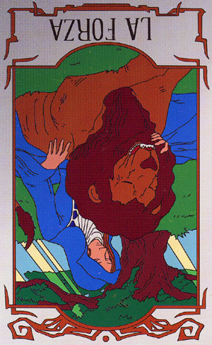 This card carries the number 11. In the Rider-Waite deck, Strength and Justice have swapped places because Waite saw links with the astrological signs Leo and Libra.