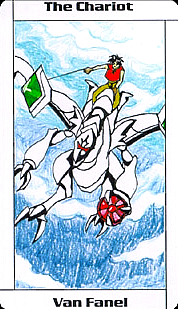 During the prevous card, The Lovers, all the wisdom of the first cards in the deck has been processed and a choice was made for personal growth. Now it's time to do something with all this baggage, to actually travel the road. A lot has been done so far, wisdoms have been accumulated and integrated into one's personality.