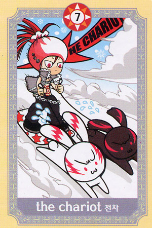 During the prevous card, The Lovers, all the wisdom of the first cards in the deck has been processed and a choice was made for personal growth. Now it's time to do something with all this baggage, to actually travel the road. A lot has been done so far, wisdoms have been accumulated and integrated into one's personality.