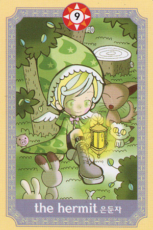The Hermit shuts out the world and retreats into solitude to better understand some spiritual aspect of life. He opens to the cosmos and lets it's wisdom sink in. Hermits are often seen as wise old men who can guide a traveller along a journey.