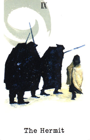 The Hermit shuts out the world and retreats into solitude to better understand some spiritual aspect of life. He opens to the cosmos and lets it's wisdom sink in. Hermits are often seen as wise old men who can guide a traveller along a journey.