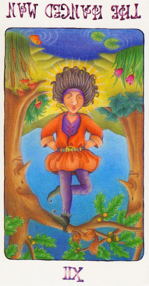 First you learned that you're not a plaything of fate, that you can make your own choices. Then you've learned how to fend for yourself and face yourself. Now, at The Hanged Man, you can learn to let go. You no longer have to cling to old values. You've found strength in yourself and by letting go, you allow growth.