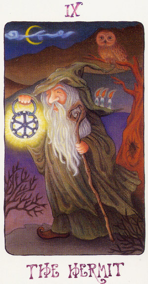 The Hermit shuts out the world and retreats into solitude to better understand some spiritual aspect of life. He opens to the cosmos and lets it's wisdom sink in. Hermits are often seen as wise old men who can guide a traveller along a journey.