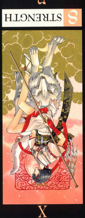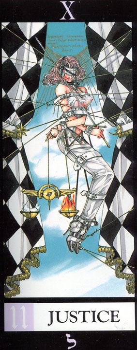 This card carries the number 11. In the Rider-Waite deck, Strength and Justice have swapped places because Waite saw links with the astrological signs Leo and Libra.