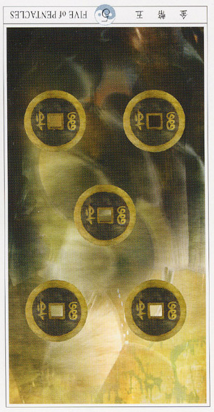 The 5 of Pentacles is an assignment-number card, and is about letting go of your securities. Pentacles element Earth (also) represents material posessions, so this card is about letting go of (some of) your worldly assets.