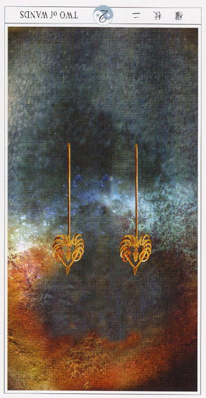 The 2 of Wands represents the research and digestion of a new idea. The number of this card and it's element are somewhat in conflict; while the 2 is focussed inwards, the Wand's element fire is outgoing. Fire wants to steam ahead while the blackbox 2 asks for patience.