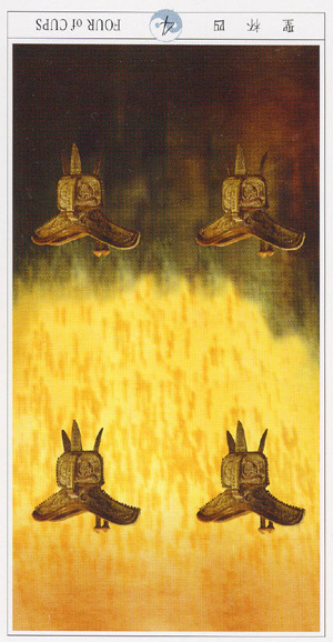 With the 4, the second cycle of this suit is commenced, where a choice between structure and feeling has to be made, where old securities have to be let go of to work towards a new future. But like Wands, Cups don't like structure much, they prefer to be free and dream rather than to make commitments and go for something.