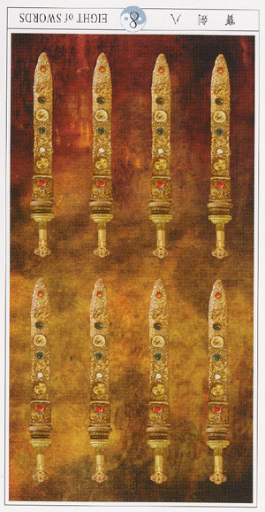 The 8 of Swords is about slowly regaining strength and energy. The 8 is an assignment number, and in the element of Swords it's a bit harder than usual.