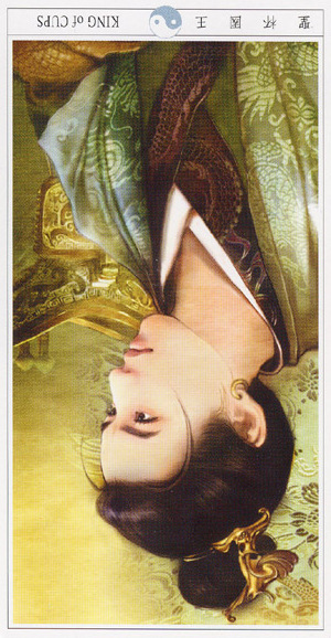 The King of Cups uses his intuition to achieve his ideals. Since Cups are turned inward, and Kings turned to the outside world, this card might be a difficult one, or it could be a powerful one.
