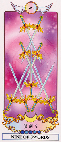 The 9 of Swords represents relief from cropped-up grief. The number 9 is a number of reward and rest and accomplishment. In the element of Swords there is not a lot of time for rest, but without any rest you'd just burn yourself out.