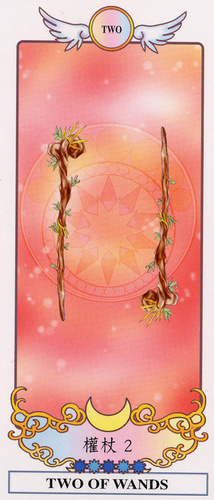 The 2 of Wands represents the research and digestion of a new idea. The number of this card and it's element are somewhat in conflict; while the 2 is focussed inwards, the Wand's element fire is outgoing. Fire wants to steam ahead while the blackbox 2 asks for patience.