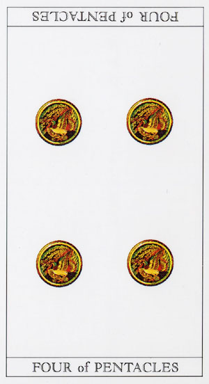 The 4 of Pentacles is about holding on to what you got. The number 4 represents structure and order, and fits well with the suit's element, Earth.